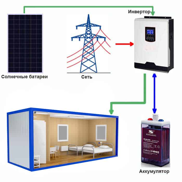 Солнечная электростанция «Бытовка - 3» подходит для использования как совместно с центральной электросетью ( объект подключен к городской сети ), так и без городской сети ( то есть в условиях полного отсутствия электроэнергии от городской сети ), к примеру небольшие удаленные объекты жилого, хозяйственного или промышленного назначения (дачи, охотничьи домики, бытовки, вахты и т.д.)